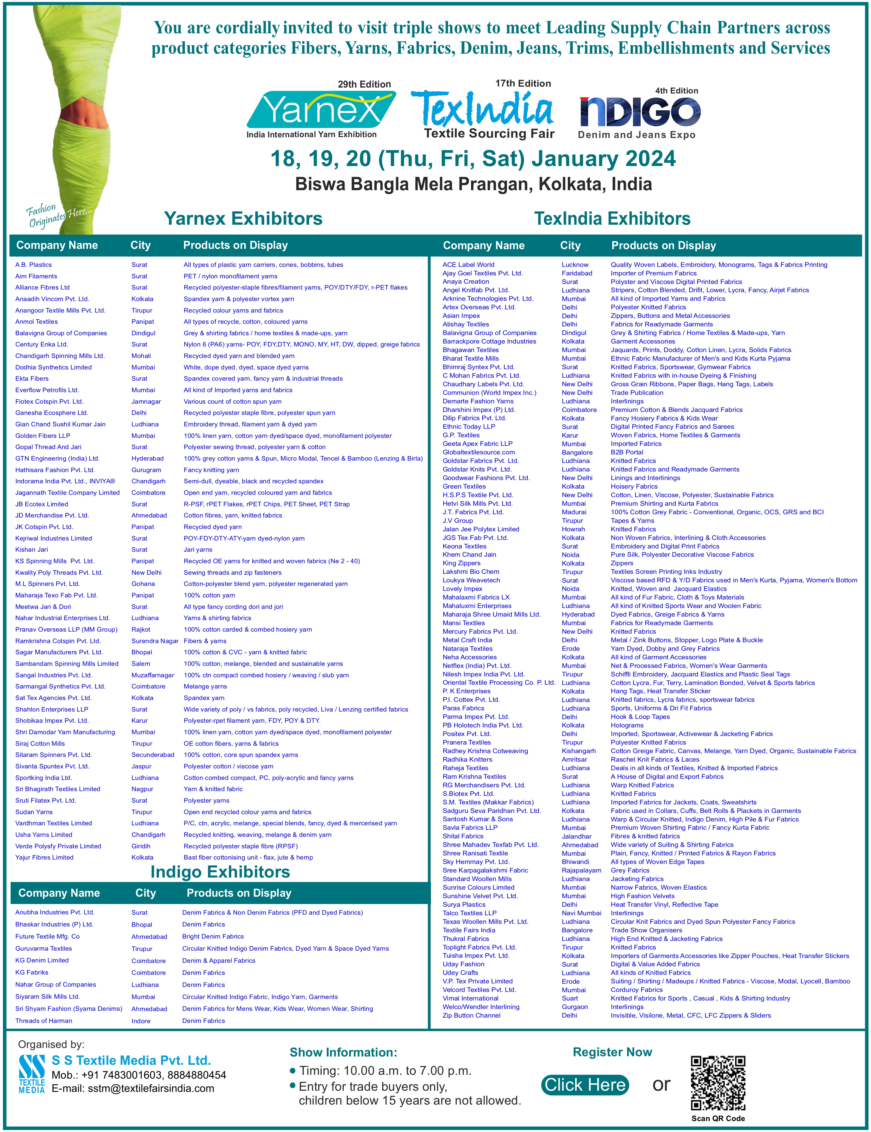 YARNEX / TEXINDIA / INDIGO Expo comes from the house of S S Textile Media Pvt. Ltd., organizers of B2B trade shows for the textile value chain under the umbrella of Textile Fairs India (TFI), showcasing SEVEN global textile fairs - YARNEX, F&A SHOW, INDIGO, DYCHEM TEXPROCESS SHOW, TEXINDIA, APPAREL SOURCING FAIR and HOMTEX running parallel to each other in major cities of India viz., Ludhiana, Kolkata, Bangalore, Mumbai, Delhi and Tirupur there by integrating the entire Textile Value Chain from Fibre to Finish to the discerning buyers.